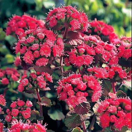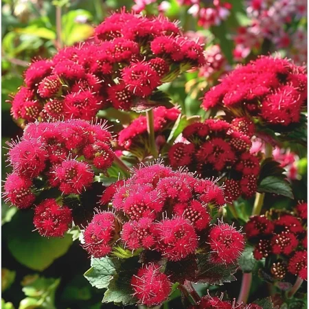 Ageratum je mali grm s ovalnim listovima i crvenim cvjetovima.